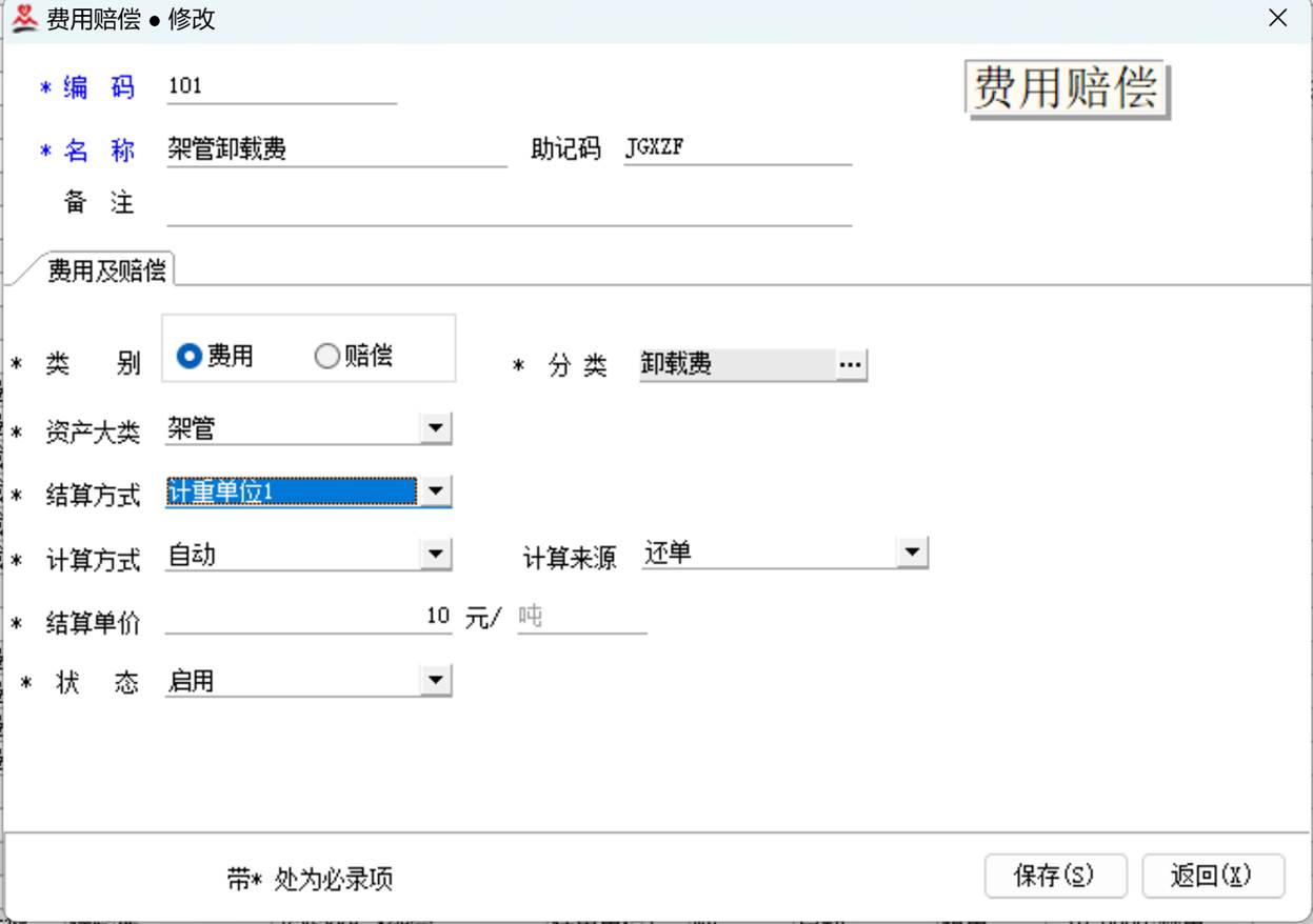功能位置:基础数据-费用赔偿设置费用或赔偿的项目,如果是自动计算,资产大类必选,结算方式必须是指定资产大类的“计量单位”,“换算单位”或“计重单位”(计重单位1或2都可以),且必须指定计算来源,即租单或还单,分别对应的是发货单和收货单,结算时根据发货单和收货单的录入的资产档案的数据进行计算。如果是手动的,则必须选择具体的单位(根,次,件,吨等),计算方式选择“手动”,在收货单、发货单副表(从表2)以及费赔单手动录入这些项目,结算时提取进行计算。对不合符规范的配置,会提示原因且不允许保存。