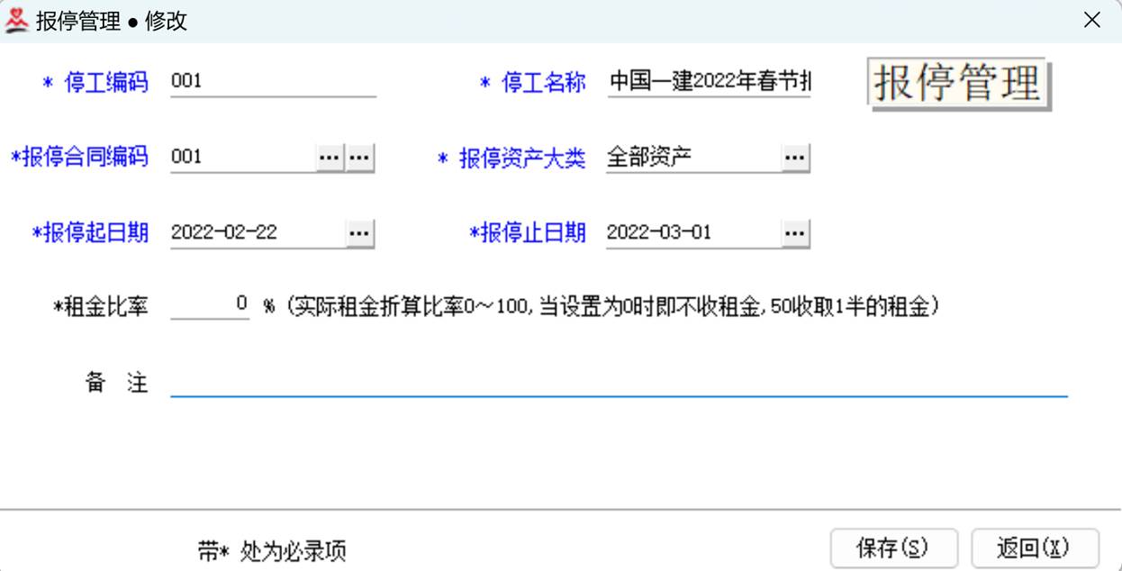 6、灵活设置节假日的报停合同和报停资产,可以设置报停租金比率,并在结算单上“摘要”处显示报停天数。