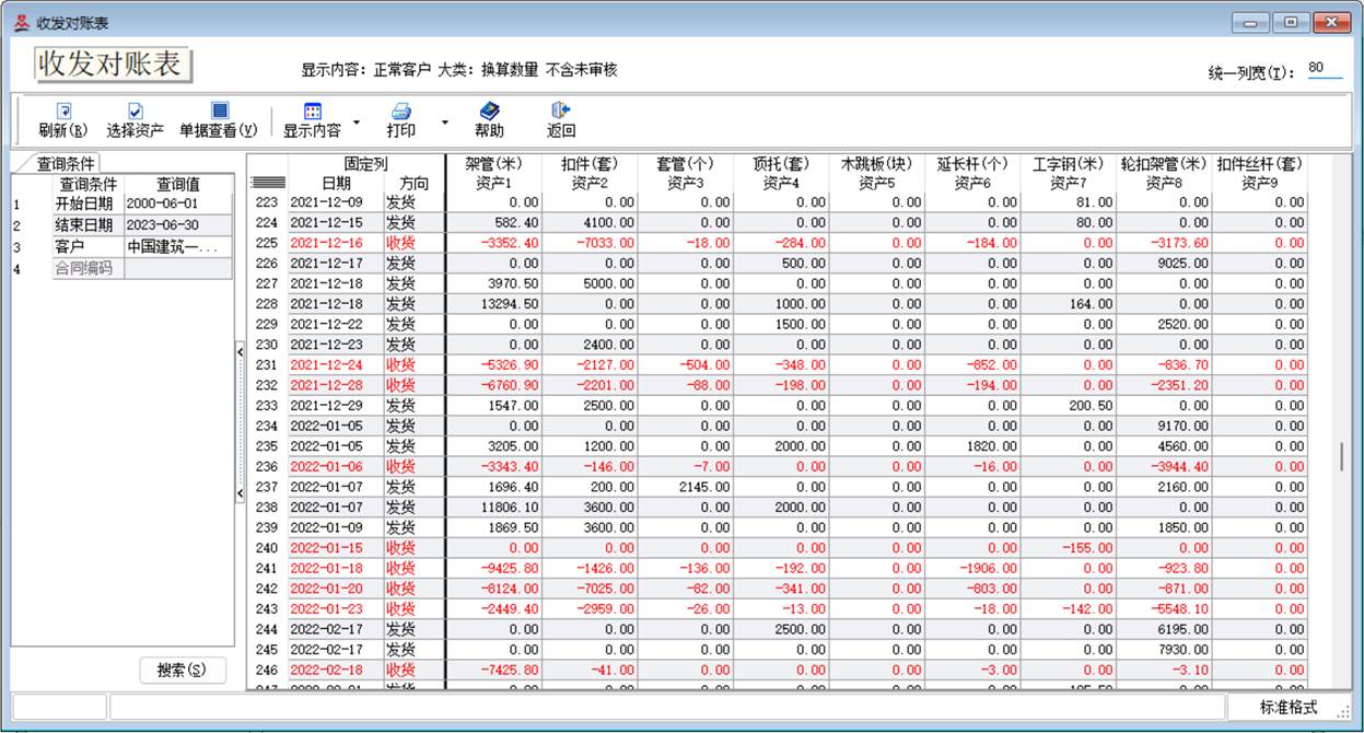 111、按倒扣结算:按每一笔发货单(含上期结存),后续的收货单抵扣该发货后的未还数截止到结算日进行计算,然后列出该发货单的抵扣收货明细,数量按存放的天数(收货日-发货日)进行计算。该结算方法支持结算天数不够按多少天计租。特点是收发日期及对应数量分列显示。以盘扣横杆,按大类计重单位1(吨)进行结算,上期结算日2022-10-25,本次结算日2022-12-25