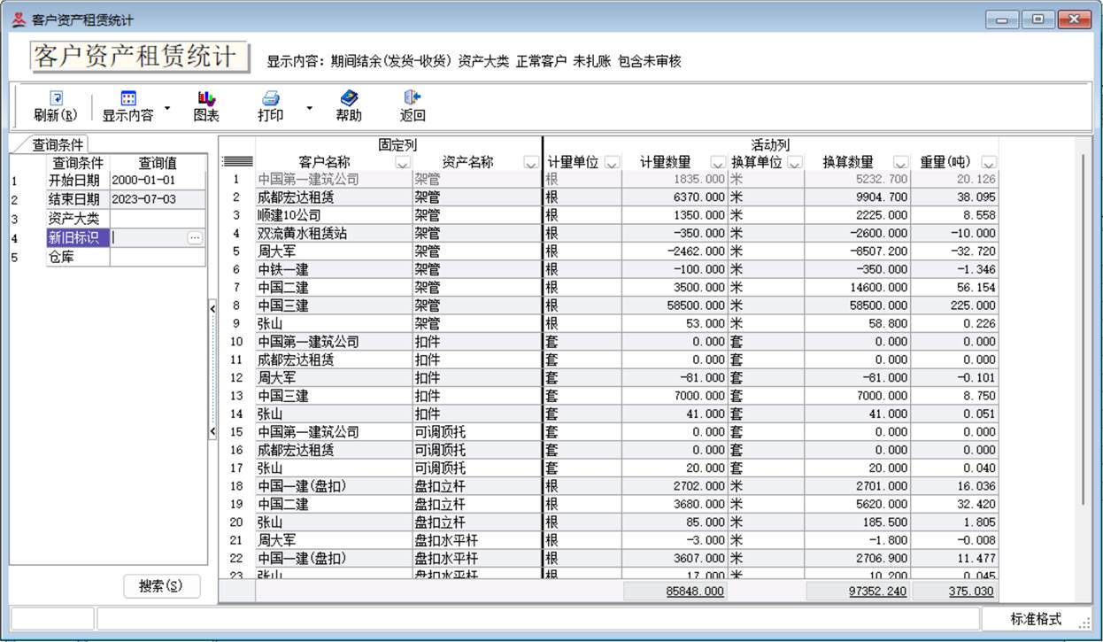 10、实时动态统计在租资产(发货、收货、未还)和库存的的具体情况。系统提供完善的分析查询统计报表,反映任意客户、任意时间段的各类物资租用总量、归还总量、在用总量及结算情况,对常用的报表并提供直观的图表功能。