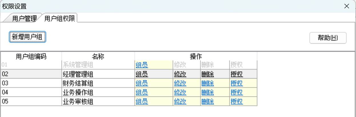 用户“管理员”不能删除,不能停用。用户组“系统管理组”不能设置,也不能删除,有所有权限。添加用户、用户组。