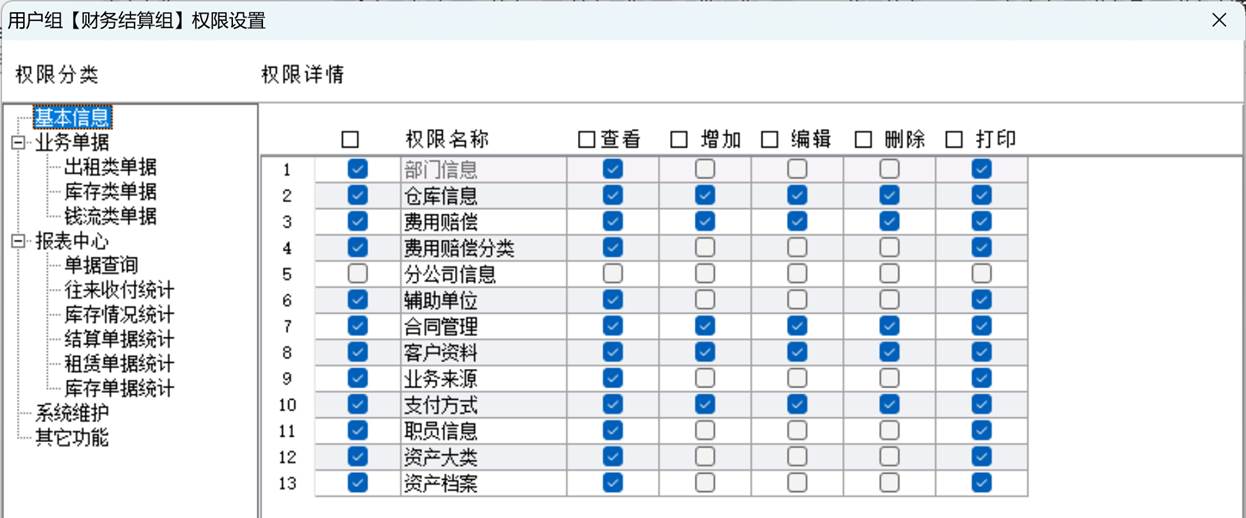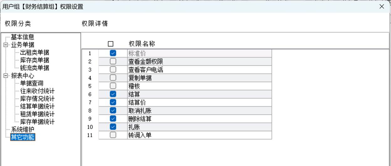 6、合同的结算,结算价设置,结账,反结账等。可以授权不同的员工具有不同的操作权限,权限精确到软件的每个细节的管理,如对单据的查看、增删改,审核,反审核等功能,加强管理,规范操作,完全满足大租赁公司的多人多机协同操作的业务管理需求。