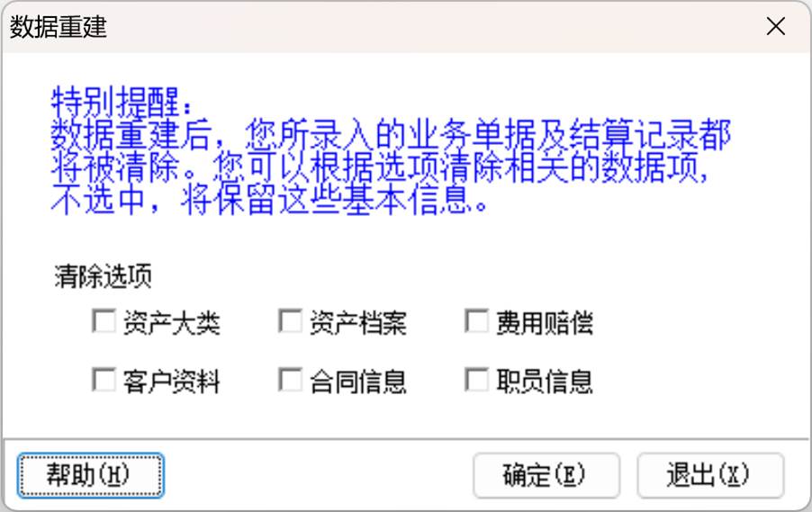 按选项清空基础档案,但业务数据都会被清空,该功能要慎用,重建时有是否要备份的提示。